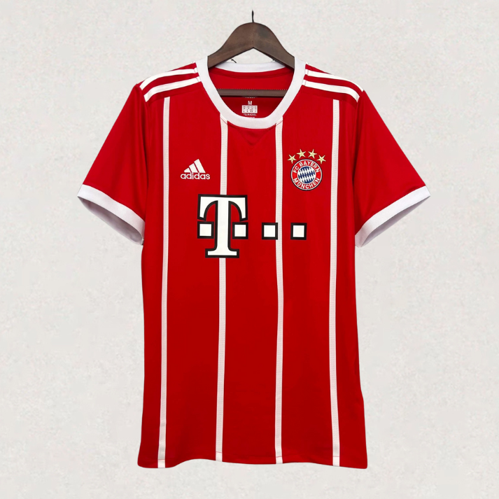 Relive the dominance of the Bavarian giants with the Bayern Munich 2017/18 Home Jersey, featuring the striking red adidas design with classic white pinstripes and the iconic T-Mobile sponsor. Worn by stars like Lewandowski, Müller, and Robben during another title-winning season, this kit exudes class and tradition.