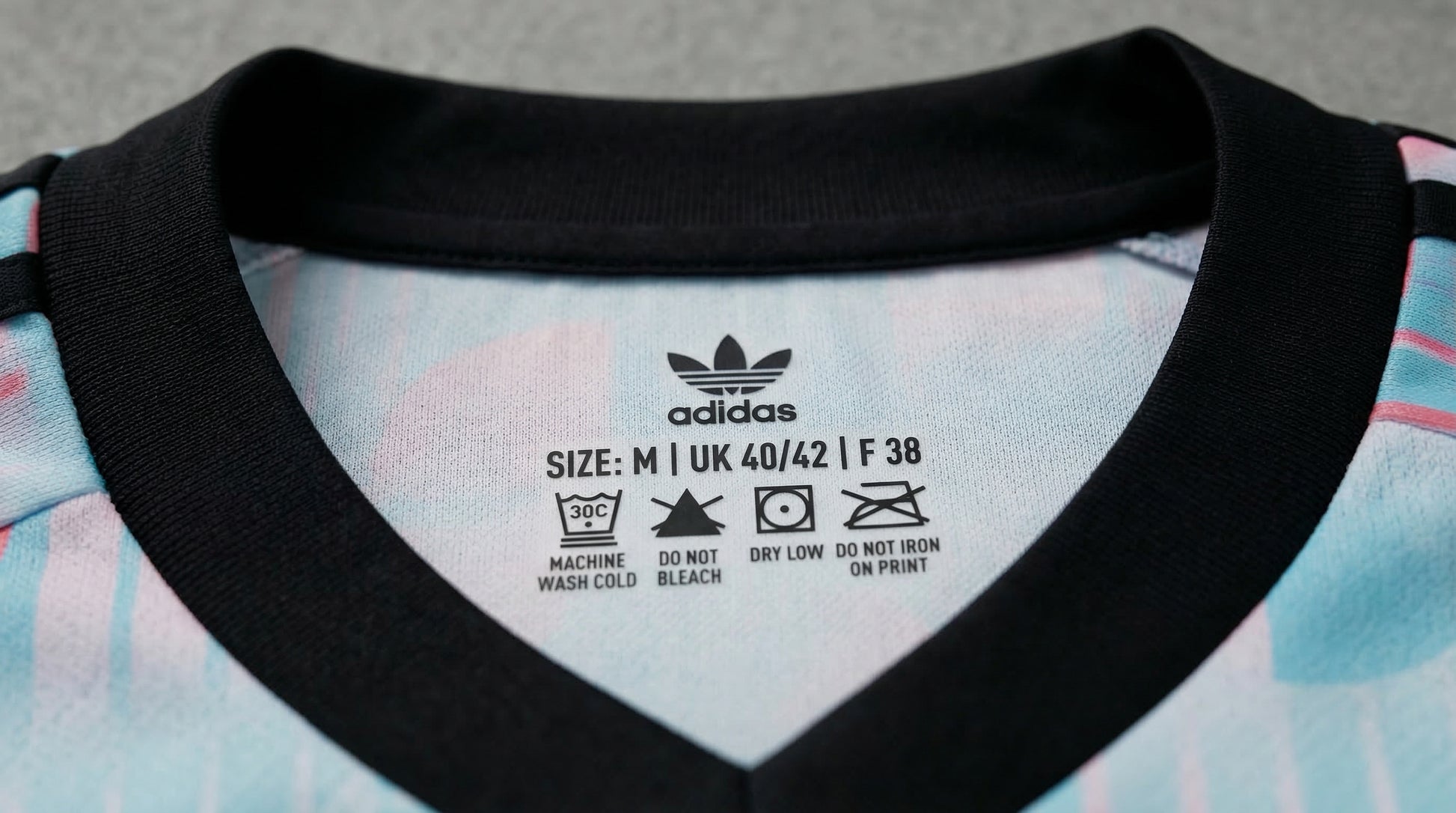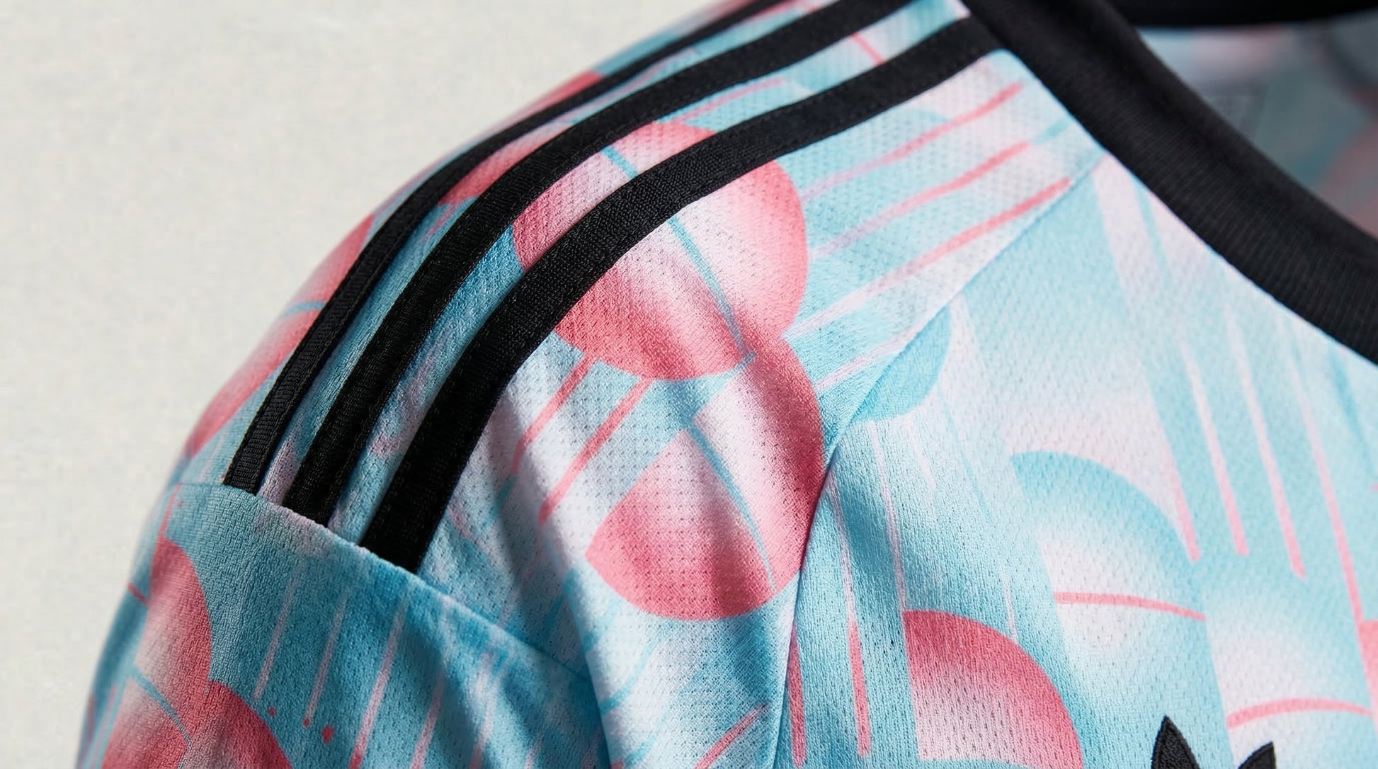 Black details on the V-neck collar, sleeve cuffs, and shoulder stripes provide strong visual contrast, grounding the colorful design and giving the jersey a sharp, premium finish. The oversized crest and Adidas retro logo add an iconic touch that elevates the overall look.